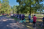By the time the tour starts, there are at least 50 bikes in the parking lot. Everyone gathers around Chris, the interpretive ranger, who kicks off the tour by talking about the trail of tears and the forced evacuation of the Cherokee down the road we all just came in on. He paints a picture for us of the loss of land, life, and homes as these people were forced to move. Then, he paints a picture of the people that came after them, farming the land that we now stand on. He tells us that he likes to focus on the people who were part of history and what the impact of history was on them. Every part of Chris’ body participates in his story telling. He is gifted with an almost magical ability to convey the feeling behind his words. There is no doubt that this tour will be different.