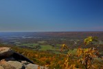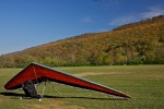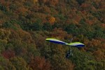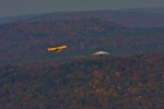 However, there are lots of aerotows going up this afternoon. With a plane creating the airspeed needed for the glider to lift and an open field that lets the plane change the direction of takeoff according to the wind, aerotows are not so wind-direction dependent. We stand and watch some of the gliders and I shoot, trying to capture both the gliders and the amazing fall leaves. Unfortunately, once again I am shooting in the early afternoon and there is both sharp light and distant haze to make me wish I’d gotten there earlier.