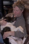 At the end of the day, the clouds have cleared and I turn to Tisen as my model. He loves to lay on the couch. He looks at me without moving except his tail. I do my best with a long exposure to get his wagging tail in motion. I can think of nothing in life that so consistently makes me smile–I never tire of a wagging tail. Then, Pat comes home and Tisen demonstrates how much he’s come to appreciate Pat by curling up on his lap. Who can resist taking a picture of that?