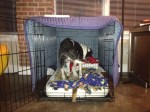 I pick up the dog and give it a squeeze. Tisen starts poking at the dog with his nose trying to make it squeak. Pat joins in and starts squeezing, too. I grab my iPhone and try to get a shot (not having time to change lenses on my camera). Tisen gets irritated with the flash, picks up red dog, and hides out in his crate. I take this as a sign that crate training is going well.