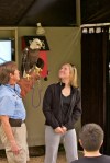 After the first show, John stands on the stage with Atsa, the bald ealge, while Dale takes Buddy, the screech owl, down the sidewalk. I stay with John and take pictures of the people stepping up to have their picture taken with Atsa.
