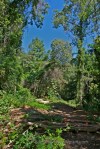Where the road intersected several trails (most still under restoration efforts, but one open to traffic), it appeared someone had been expressing their artistic talents in wood.  A collection of what appeared to be bird houses lined the main intersection.  A giant sculpture of a hiking man created by creatively placing a forked log and adding appendages made a very cool trail marker.