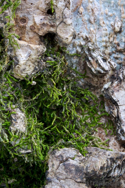 I like the relationship of the moss and the bark. The moss has found its way into the cracks and crevices and filled a gap in the surface of the tree. I don’t know if the moss benefits the tree in any way or if this is a one-way relationship.