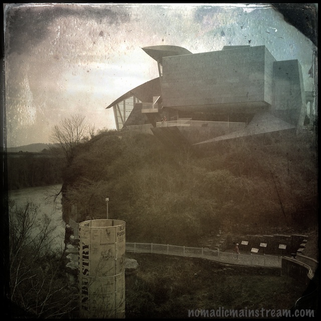 In today’s examples, I had a hard time picking between the image of the Hunter museum that shows the switch-back trail going down the slope in the foreground (one of the things about the riverfront I find amusing) and the image that includes the silo-like structure in the foreground.  I particularly like the silhouette people on the overlook at the Hunter Museum in the first example.  But the silo-thing is such a part of the landscape, it’s hard to resist.