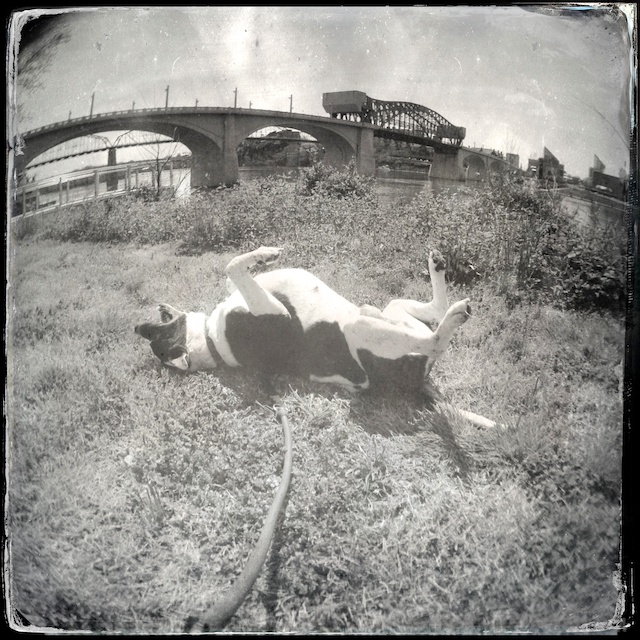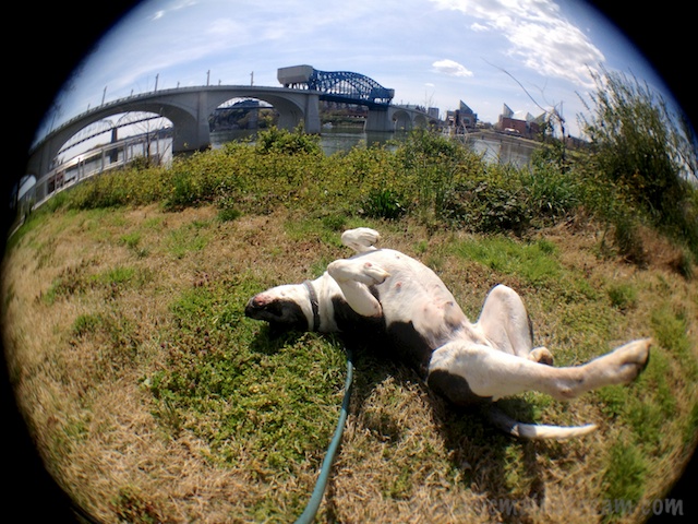 I really like the fisheye effect for putting Tisen into an image that includes local landmarks across the horizon. While I had fun with this in the images posted yesterday, I especially like the images of Tisen rolling in the grass in the foreground with the Market Street Bridge (and glimpses of Walnut Street Bridge) in the background.