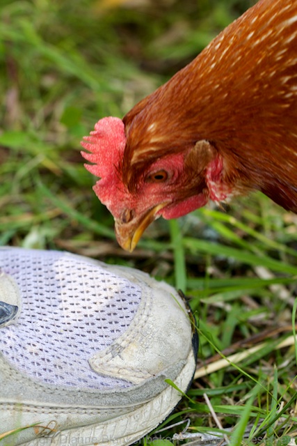 IMG_2398 Published May 4, 2014 at 427 × 640 in Meet Tom Turkey ← Previous Next → Chicken hen checking out Pat’s shoe