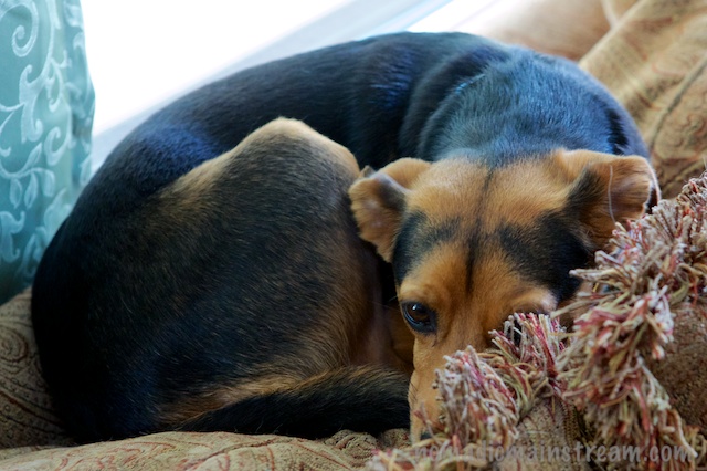 I got only one shot each of the dogs before they disappeared until little Elliott, fooled by the camera being placed on the coffee table for a while, decided it was time to reclaim his favorite spot on the sofa.  He curled his tiny body into a tight ball on the top edge of the sofa pillows.  As soon as I grabbed my camera, he hunkered down, attempting to hide himself behind the pillow fringe.