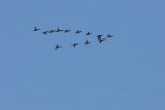 As I shoot the White Pelican, I see a cluster of Sandhill Cranes standing on the shore behind the flight of the pelican.  There are only a dozen or so gathered there, but we can hear what must be hundreds of Sandhill Cranes gabbing away at one another.  They are an impossibly loud bird whose voice can carry a mile or more.