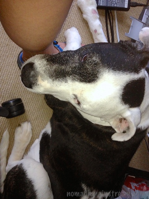 But the other day, when our inside temperature was pushing 80 (yes, I am trying to make it to June with no A/C), she had no qualms or self-consciousness about flopping down on the floor in as unladylike a pose as imaginable.  And I found it so amusing that I had no qualms about taking a few photos (using the Camera! app on the iPhone) to share with you.