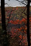 The park is a state park, it turns out. And it costs $5 to enter. I guess that’s the downsize of going to a park that’s listed as a top 10 destination. We drive in and find the first overlook. I decide to take my camera with me as the leaves are beautiful and the sun is getting lower in the sky, making for better lighting than my hang gliding shots earlier today. Pat takes my still-assembled tripod out of the back of the car and carries it over his shoulder. The legs are still extended and it hangs out far behind him.