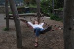 We continue up the incline, much of it as steep as basement stairs. We pass enormous trees covered in graffiti as well as ancient ruins also covered in graffiti–we are surprised by the tagging every where in this relatively small town. At last, the climb gives way to a flat place where a playground with large wood structures provides a place for young children who aren’t exhausted to burn off energy while their parents catch their breath. I notice there aren’t any children here. I recline on a chain link hammock in the middle of the structure long enough for Pat to take a rare photo of me. When I view the photo on my camera, I remember why I prefer to stay on the other side of the lens.