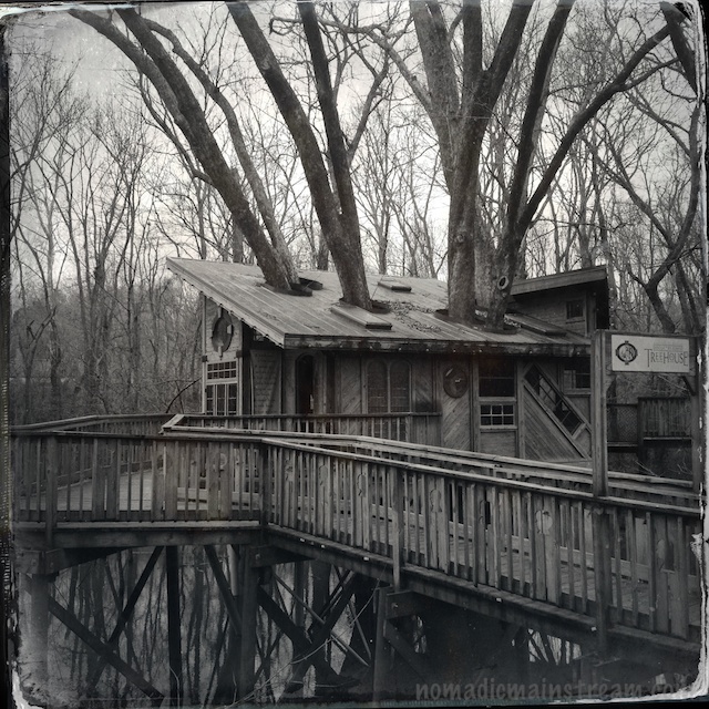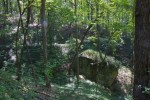We walk on up the trail, climbing up the side of Lookout Mountain a bit. The shade grows deeper–a welcome relief. I make a mental note not to start a hike at noon in August in Chattanooga as we find some relief in the cooler shade only to be attacked by more eye-obsessed insects. The forest floor is covered with myrtle or vinca (I never could tell them apart) in parts, but the poison ivy is so prevalent that I can’t imagine anyone wanting to undertake removing the invasive ground cover. It’s beautiful none-the-less. The advantage of being out on a hot afternoon is that no one else is there. The birdsongs are disrupted only by the sounds of trains passing through the valley. We hear rustling in the leaves and look around, me immediately getting my camera ready this time. Eventually spotting the source of the noise, we are just in time to spot a gray squirrel jumping from the ground to the back of a tree, hidden from view. I wonder again why I am carrying 20 pounds of equipment. Then I remind myself that Pat is now carrying at least 10 of those pounds and probably wondering the same thing; I decide not to complain.