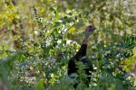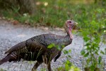 We work our way further up the hill, the woods deepening and getting more quiet. I wish that we would have chosen a higher route–the shade and solitude are more enjoyable than the hot hike along the road. As we relax into the cooler, quieter setting, I experience a growing sense of peacefulness that reminds me why I hike and erases the irritations of heat and bugs. However, it turns out that we are nearing the end of our hike. The path turns downhill and we see the loop road ahead. Just then, we spot three wild turkeys. This time, I am ready. I set up my camera and start shooting. One of the turkeys seems curious about the sound of my camera. It pauses behind thin cover and plays peek-a-boo as if it thinks it’s well hidden. I congratulate myself for bringing my telephoto lens, thinking the weight was well worth it.