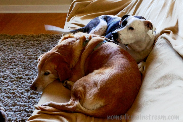 Every time Twiggy comes to stay, she and Tisen seem to get a little cozier. They went from taking turns sleeping on the sofa while the other slept on the floor, to each choosing an opposite end of the sofa, to now curling up together in the same spot. Sometimes, the spot is me. I wish I’d figured out how to take pictures of this–they piled up on top of me like I was part of the furniture. At one point, Tisen was literally straddling Twiggy while she was laying in my lap.