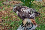 After flying Cody, we get to meet Franklin, an American Kestrel, and a Harris’s Hawk whose name escapes me. I’ve never seen a Harris’s Hawk before. He is beautiful–rich browns blend into black, which contrasts with the white in his tail.