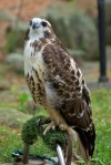 Next, we get to fly Cody, a Red-tail Hawk who refuses to hunt. Cody glides even closer to the ground, skimming just inches above the surface, and then swoops up in a sharp arc just before reaching me. I notice he flares with his feathers as well as his wings. Every feather spreads, his tail dramatically opening like a fan. Just as with the owl, this flare brings him nearly to a halt so that when he lands on my arm, there is no impact. It’s like he parachuted down gently.