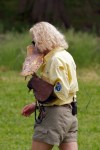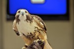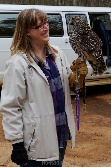 The owls are always a favorite for visitors–perhaps because they’re the only raptors in the program who enjoy being petted.  If you scratch the back of Artie’s neck just right, he rolls his head back, his eyelids close and you could almost swear you hear him moan.