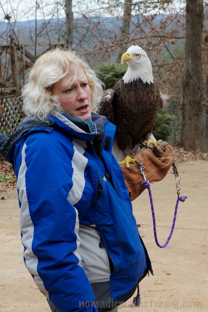 S.O.A.R. offers an opportunity to have an intimate experience with their birds called “The Raptor Experience.”  This is actually how I first met Dale and John, the birds caretakers and directors in the organization.  About a year ago, I saw their poster at the Lookout Mountain Flight Park when we were taking hang gliding lessons.  Pat and I called and scheduled our experience and were amazed by the whole thing.
