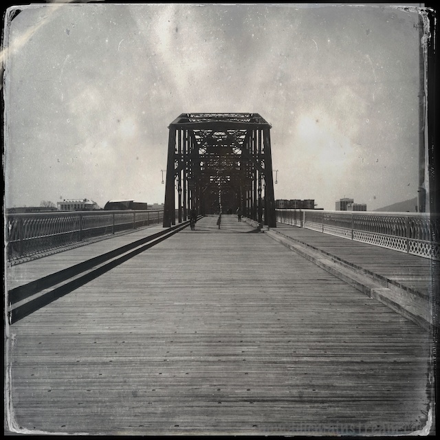 After spending a busy day sight-seeing and relaxing with an afternoon nap, we decide tonight is the right occasion to give it a try. Pat, my husband, Megan and I head out on foot towards the Walnut Street Bridge. The sun is low in the sky, creating the orangey glow on the bridge that always makes everything look magical. Arriving at the bridge, we find crowds of people making their way towards their evening destinations as well as groups for whom the bridge is their destination. The former weave their way around the latter, moving at a faster pace. We have allowed an hour for our 10-minute walk, our dinner reservation not being until 8PM, so we move slowly and stop often. With the sun low and the breeze kicking up, the temperature has dropped and encourages us to linger.